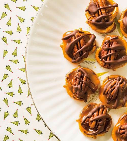- Spread the pretzels on the baking sheet. Using two lightly oiled teaspoons, place 5 ml (1 teaspoon) of caramel in the centre of each pretzel. Place a pecan half on the caramel, pressing lightly. With a spoon, drizzle the chocolate over the pretzel bites. Let cool completely, about 30 minutes or until the chocolate is firm. Store in an airtight container at room temperature for about 1 week, separating each layer with a sheet of parchment paper.
